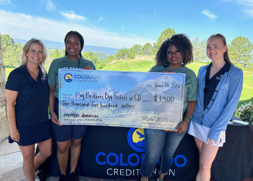 Sarah Haertl, VP of Marketing, and Teagan Griffith, Community Impact Manager, presented the check donation to the CEO of Big Brothers Big Sisters of Colorado, Elycia Cook, and Director of Strategic Partnerships, Lakeasha Smith, at their annual Golf Classic event.